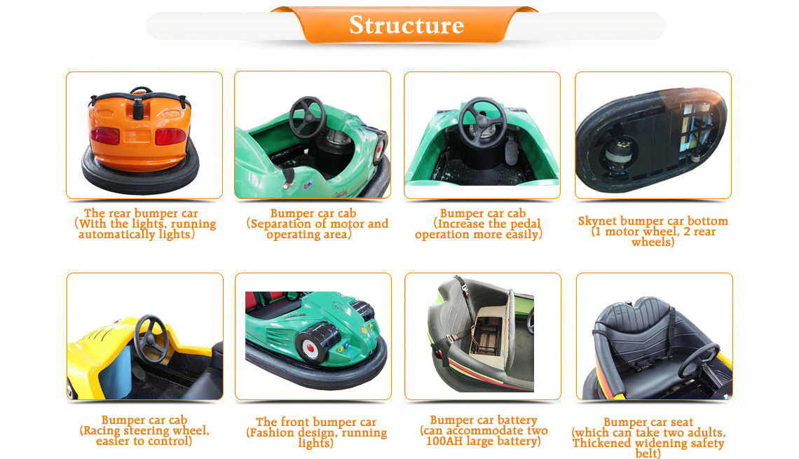 | FAQ: The difference between these three kinds : 1.Battery-driven bumper car's power by Batter. 2.Ground-Grid Electric Bumper Car's power come from Ground-Grid , it need lay armor plate on the floor , then input electric to the armor plate ,so the cars running on the armor plate. 3.Electric net bumper car's anode is in the ceiling and cathode is on the floor ,the ceiling made by sheet iron and also need lay armor plate on the floor. | |